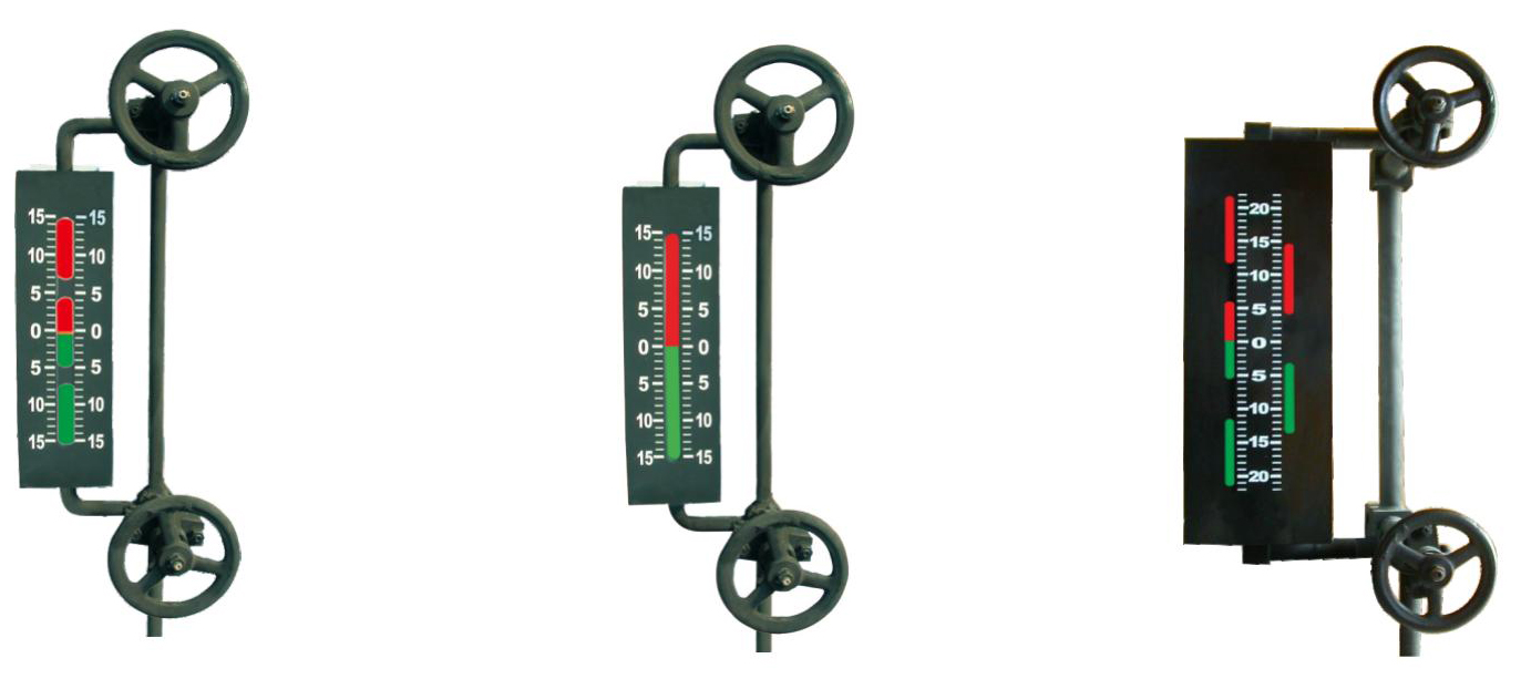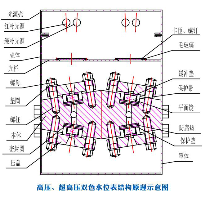 五窗、七窗、九窗水位表觀察孔在表體的兩條直線上,通過將觀測孔交錯(cuò)組合消除了中間盲區(qū)。由光源發(fā)出的光通過紅、綠濾色鏡片,射向水位表體液腔,在表面內(nèi)汽相部分,紅光射向正前方,而綠光斜射到壁上被吸收。而在表體內(nèi)液相部分,由于水的折射使綠光射向正前方,而紅光斜射到壁上被吸收。因此在正前方觀測將獲得汽紅、水綠、汽滿全紅、水滿全綠的顯示效果。